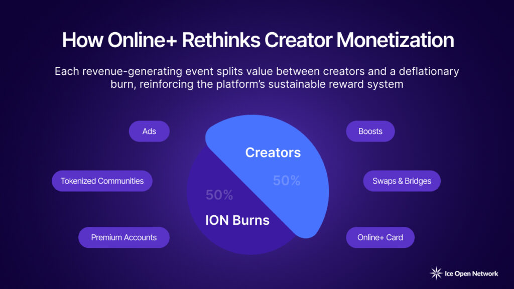At the core of it all is ION’s deflationary 50/50 loop — the system that takes revenue generated inside Online+ and automatically splits it between creator rewards and ION token burns.